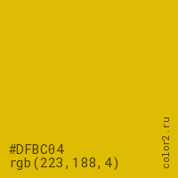 Цвет #DFBC04 в цветовой модели RGB обозначается тремя октетами (223, 188, 4) в десятичном формате и #DFBC04 в шестнадцатиричном (hex) формате, которые являются интенсивностью красного 223 (hex DF), интенсивность зелёного 188 (hex BC) и интенсивность синего 4 (hex 04).
