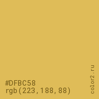 Цвет #DFBC58 в цветовой модели RGB обозначается тремя октетами (223, 188, 88) в десятичном формате и #DFBC58 в шестнадцатиричном (hex) формате, которые являются интенсивностью красного 223 (hex DF), интенсивность зелёного 188 (hex BC) и интенсивность синего 88 (hex 58).