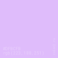 Цвет #DFBCFB в цветовой модели RGB обозначается тремя октетами (223, 188, 251) в десятичном формате и #DFBCFB в шестнадцатиричном (hex) формате, которые являются интенсивностью красного 223 (hex DF), интенсивность зелёного 188 (hex BC) и интенсивность синего 251 (hex FB).