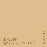 Цвет #DFBD8F в цветовой модели RGB обозначается тремя октетами (223, 189, 143) в десятичном формате и #DFBD8F в шестнадцатиричном (hex) формате, которые являются интенсивностью красного 223 (hex DF), интенсивность зелёного 189 (hex BD) и интенсивность синего 143 (hex 8F).