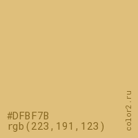 Цвет #DFBF7B в цветовой модели RGB обозначается тремя октетами (223, 191, 123) в десятичном формате и #DFBF7B в шестнадцатиричном (hex) формате, которые являются интенсивностью красного 223 (hex DF), интенсивность зелёного 191 (hex BF) и интенсивность синего 123 (hex 7B).