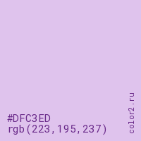 Цвет #DFC3ED в цветовой модели RGB обозначается тремя октетами (223, 195, 237) в десятичном формате и #DFC3ED в шестнадцатиричном (hex) формате, которые являются интенсивностью красного 223 (hex DF), интенсивность зелёного 195 (hex C3) и интенсивность синего 237 (hex ED).