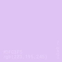 Цвет RGB(223, 195, 245) в процентом отношении количества цвета состоит из 87.5% красного (red), 76.5% зелёного (green) и 96.1% синего (blue).