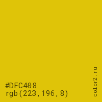Цвет #DFC408 в цветовой модели RGB обозначается тремя октетами (223, 196, 8) в десятичном формате и #DFC408 в шестнадцатиричном (hex) формате, которые являются интенсивностью красного 223 (hex DF), интенсивность зелёного 196 (hex C4) и интенсивность синего 8 (hex 08).