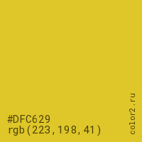Цвет #DFC629 в цветовой модели RGB обозначается тремя октетами (223, 198, 41) в десятичном формате и #DFC629 в шестнадцатиричном (hex) формате, которые являются интенсивностью красного 223 (hex DF), интенсивность зелёного 198 (hex C6) и интенсивность синего 41 (hex 29).