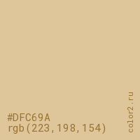 Цвет #DFC69A в цветовой модели RGB обозначается тремя октетами (223, 198, 154) в десятичном формате и #DFC69A в шестнадцатиричном (hex) формате, которые являются интенсивностью красного 223 (hex DF), интенсивность зелёного 198 (hex C6) и интенсивность синего 154 (hex 9A).