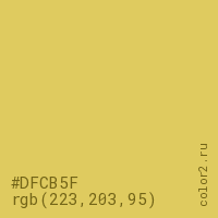Цвет #DFCB5F в цветовой модели RGB обозначается тремя октетами (223, 203, 95) в десятичном формате и #DFCB5F в шестнадцатиричном (hex) формате, которые являются интенсивностью красного 223 (hex DF), интенсивность зелёного 203 (hex CB) и интенсивность синего 95 (hex 5F).