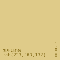 Цвет #DFCB89 в цветовой модели RGB обозначается тремя октетами (223, 203, 137) в десятичном формате и #DFCB89 в шестнадцатиричном (hex) формате, которые являются интенсивностью красного 223 (hex DF), интенсивность зелёного 203 (hex CB) и интенсивность синего 137 (hex 89).