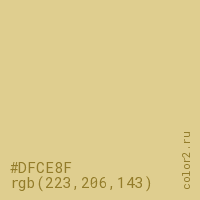 Цвет #DFCE8F в цветовой модели RGB обозначается тремя октетами (223, 206, 143) в десятичном формате и #DFCE8F в шестнадцатиричном (hex) формате, которые являются интенсивностью красного 223 (hex DF), интенсивность зелёного 206 (hex CE) и интенсивность синего 143 (hex 8F).