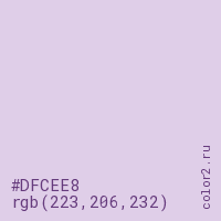 Цвет #DFCEE8 в цветовой модели RGB обозначается тремя октетами (223, 206, 232) в десятичном формате и #DFCEE8 в шестнадцатиричном (hex) формате, которые являются интенсивностью красного 223 (hex DF), интенсивность зелёного 206 (hex CE) и интенсивность синего 232 (hex E8).
