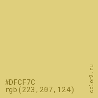 Цвет #DFCF7C в цветовой модели RGB обозначается тремя октетами (223, 207, 124) в десятичном формате и #DFCF7C в шестнадцатиричном (hex) формате, которые являются интенсивностью красного 223 (hex DF), интенсивность зелёного 207 (hex CF) и интенсивность синего 124 (hex 7C).