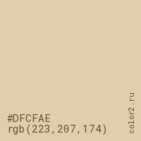 Цвет #DFCFAE в цветовой модели RGB обозначается тремя октетами (223, 207, 174) в десятичном формате и #DFCFAE в шестнадцатиричном (hex) формате, которые являются интенсивностью красного 223 (hex DF), интенсивность зелёного 207 (hex CF) и интенсивность синего 174 (hex AE).