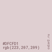 Цвет #DFCFD1 в цветовой модели RGB обозначается тремя октетами (223, 207, 209) в десятичном формате и #DFCFD1 в шестнадцатиричном (hex) формате, которые являются интенсивностью красного 223 (hex DF), интенсивность зелёного 207 (hex CF) и интенсивность синего 209 (hex D1).