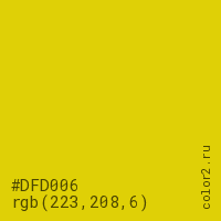 Цвет #DFD006 в цветовой модели RGB обозначается тремя октетами (223, 208, 6) в десятичном формате и #DFD006 в шестнадцатиричном (hex) формате, которые являются интенсивностью красного 223 (hex DF), интенсивность зелёного 208 (hex D0) и интенсивность синего 6 (hex 06).