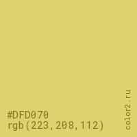 Цвет #DFD070 в цветовой модели RGB обозначается тремя октетами (223, 208, 112) в десятичном формате и #DFD070 в шестнадцатиричном (hex) формате, которые являются интенсивностью красного 223 (hex DF), интенсивность зелёного 208 (hex D0) и интенсивность синего 112 (hex 70).