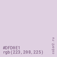 Цвет #DFD0E1 в цветовой модели RGB обозначается тремя октетами (223, 208, 225) в десятичном формате и #DFD0E1 в шестнадцатиричном (hex) формате, которые являются интенсивностью красного 223 (hex DF), интенсивность зелёного 208 (hex D0) и интенсивность синего 225 (hex E1).