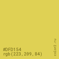 Цвет #DFD154 в цветовой модели RGB обозначается тремя октетами (223, 209, 84) в десятичном формате и #DFD154 в шестнадцатиричном (hex) формате, которые являются интенсивностью красного 223 (hex DF), интенсивность зелёного 209 (hex D1) и интенсивность синего 84 (hex 54).
