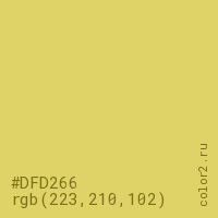 Цвет #DFD266 в цветовой модели RGB обозначается тремя октетами (223, 210, 102) в десятичном формате и #DFD266 в шестнадцатиричном (hex) формате, которые являются интенсивностью красного 223 (hex DF), интенсивность зелёного 210 (hex D2) и интенсивность синего 102 (hex 66).