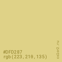 Цвет #DFD287 в цветовой модели RGB обозначается тремя октетами (223, 210, 135) в десятичном формате и #DFD287 в шестнадцатиричном (hex) формате, которые являются интенсивностью красного 223 (hex DF), интенсивность зелёного 210 (hex D2) и интенсивность синего 135 (hex 87).