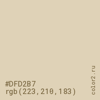 Цвет #DFD2B7 в цветовой модели RGB обозначается тремя октетами (223, 210, 183) в десятичном формате и #DFD2B7 в шестнадцатиричном (hex) формате, которые являются интенсивностью красного 223 (hex DF), интенсивность зелёного 210 (hex D2) и интенсивность синего 183 (hex B7).