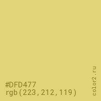 Цвет #DFD477 в цветовой модели RGB обозначается тремя октетами (223, 212, 119) в десятичном формате и #DFD477 в шестнадцатиричном (hex) формате, которые являются интенсивностью красного 223 (hex DF), интенсивность зелёного 212 (hex D4) и интенсивность синего 119 (hex 77).
