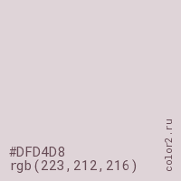 Цвет #DFD4D8 в цветовой модели RGB обозначается тремя октетами (223, 212, 216) в десятичном формате и #DFD4D8 в шестнадцатиричном (hex) формате, которые являются интенсивностью красного 223 (hex DF), интенсивность зелёного 212 (hex D4) и интенсивность синего 216 (hex D8).