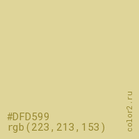 Цвет #DFD599 в цветовой модели RGB обозначается тремя октетами (223, 213, 153) в десятичном формате и #DFD599 в шестнадцатиричном (hex) формате, которые являются интенсивностью красного 223 (hex DF), интенсивность зелёного 213 (hex D5) и интенсивность синего 153 (hex 99).