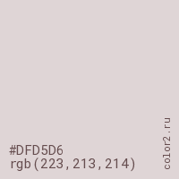 Цвет #DFD5D6 в цветовой модели RGB обозначается тремя октетами (223, 213, 214) в десятичном формате и #DFD5D6 в шестнадцатиричном (hex) формате, которые являются интенсивностью красного 223 (hex DF), интенсивность зелёного 213 (hex D5) и интенсивность синего 214 (hex D6).