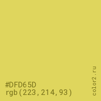 Цвет #DFD65D в цветовой модели RGB обозначается тремя октетами (223, 214, 93) в десятичном формате и #DFD65D в шестнадцатиричном (hex) формате, которые являются интенсивностью красного 223 (hex DF), интенсивность зелёного 214 (hex D6) и интенсивность синего 93 (hex 5D).