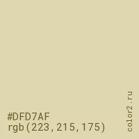 Цвет #DFD7AF в цветовой модели RGB обозначается тремя октетами (223, 215, 175) в десятичном формате и #DFD7AF в шестнадцатиричном (hex) формате, которые являются интенсивностью красного 223 (hex DF), интенсивность зелёного 215 (hex D7) и интенсивность синего 175 (hex AF).