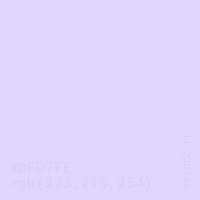 Цвет #DFD7FE в цветовой модели RGB обозначается тремя октетами (223, 215, 254) в десятичном формате и #DFD7FE в шестнадцатиричном (hex) формате, которые являются интенсивностью красного 223 (hex DF), интенсивность зелёного 215 (hex D7) и интенсивность синего 254 (hex FE).