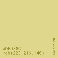 Цвет #DFD88C в цветовой модели RGB обозначается тремя октетами (223, 216, 140) в десятичном формате и #DFD88C в шестнадцатиричном (hex) формате, которые являются интенсивностью красного 223 (hex DF), интенсивность зелёного 216 (hex D8) и интенсивность синего 140 (hex 8C).