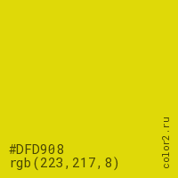 Цвет #DFD908 в цветовой модели RGB обозначается тремя октетами (223, 217, 8) в десятичном формате и #DFD908 в шестнадцатиричном (hex) формате, которые являются интенсивностью красного 223 (hex DF), интенсивность зелёного 217 (hex D9) и интенсивность синего 8 (hex 08).