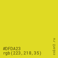 Цвет #DFDA23 в цветовой модели RGB обозначается тремя октетами (223, 218, 35) в десятичном формате и #DFDA23 в шестнадцатиричном (hex) формате, которые являются интенсивностью красного 223 (hex DF), интенсивность зелёного 218 (hex DA) и интенсивность синего 35 (hex 23).