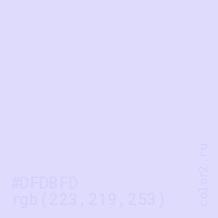 Цвет #DFDBFD в цветовой модели RGB обозначается тремя октетами (223, 219, 253) в десятичном формате и #DFDBFD в шестнадцатиричном (hex) формате, которые являются интенсивностью красного 223 (hex DF), интенсивность зелёного 219 (hex DB) и интенсивность синего 253 (hex FD).