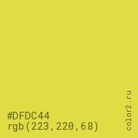Цвет #DFDC44 в цветовой модели RGB обозначается тремя октетами (223, 220, 68) в десятичном формате и #DFDC44 в шестнадцатиричном (hex) формате, которые являются интенсивностью красного 223 (hex DF), интенсивность зелёного 220 (hex DC) и интенсивность синего 68 (hex 44).