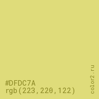 Цвет #DFDC7A в цветовой модели RGB обозначается тремя октетами (223, 220, 122) в десятичном формате и #DFDC7A в шестнадцатиричном (hex) формате, которые являются интенсивностью красного 223 (hex DF), интенсивность зелёного 220 (hex DC) и интенсивность синего 122 (hex 7A).