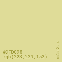 Цвет #DFDC98 в цветовой модели RGB обозначается тремя октетами (223, 220, 152) в десятичном формате и #DFDC98 в шестнадцатиричном (hex) формате, которые являются интенсивностью красного 223 (hex DF), интенсивность зелёного 220 (hex DC) и интенсивность синего 152 (hex 98).