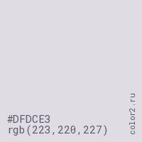 Цвет #DFDCE3 в цветовой модели RGB обозначается тремя октетами (223, 220, 227) в десятичном формате и #DFDCE3 в шестнадцатиричном (hex) формате, которые являются интенсивностью красного 223 (hex DF), интенсивность зелёного 220 (hex DC) и интенсивность синего 227 (hex E3).