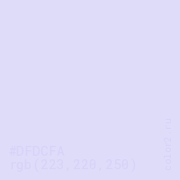 Цвет RGB(223, 220, 250) в процентом отношении количества цвета состоит из 87.5% красного (red), 86.3% зелёного (green) и 98% синего (blue).