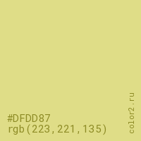 Цвет #DFDD87 в цветовой модели RGB обозначается тремя октетами (223, 221, 135) в десятичном формате и #DFDD87 в шестнадцатиричном (hex) формате, которые являются интенсивностью красного 223 (hex DF), интенсивность зелёного 221 (hex DD) и интенсивность синего 135 (hex 87).