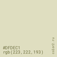 Цвет #DFDEC1 в цветовой модели RGB обозначается тремя октетами (223, 222, 193) в десятичном формате и #DFDEC1 в шестнадцатиричном (hex) формате, которые являются интенсивностью красного 223 (hex DF), интенсивность зелёного 222 (hex DE) и интенсивность синего 193 (hex C1).