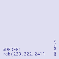Цвет #DFDEF1 в цветовой модели RGB обозначается тремя октетами (223, 222, 241) в десятичном формате и #DFDEF1 в шестнадцатиричном (hex) формате, которые являются интенсивностью красного 223 (hex DF), интенсивность зелёного 222 (hex DE) и интенсивность синего 241 (hex F1).