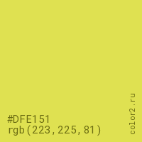 Цвет #DFE151 в цветовой модели RGB обозначается тремя октетами (223, 225, 81) в десятичном формате и #DFE151 в шестнадцатиричном (hex) формате, которые являются интенсивностью красного 223 (hex DF), интенсивность зелёного 225 (hex E1) и интенсивность синего 81 (hex 51).