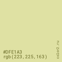 Цвет #DFE1A3 в цветовой модели RGB обозначается тремя октетами (223, 225, 163) в десятичном формате и #DFE1A3 в шестнадцатиричном (hex) формате, которые являются интенсивностью красного 223 (hex DF), интенсивность зелёного 225 (hex E1) и интенсивность синего 163 (hex A3).