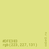 Цвет #DFE383 в цветовой модели RGB обозначается тремя октетами (223, 227, 131) в десятичном формате и #DFE383 в шестнадцатиричном (hex) формате, которые являются интенсивностью красного 223 (hex DF), интенсивность зелёного 227 (hex E3) и интенсивность синего 131 (hex 83).