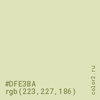 Цвет #DFE3BA в цветовой модели RGB обозначается тремя октетами (223, 227, 186) в десятичном формате и #DFE3BA в шестнадцатиричном (hex) формате, которые являются интенсивностью красного 223 (hex DF), интенсивность зелёного 227 (hex E3) и интенсивность синего 186 (hex BA).
