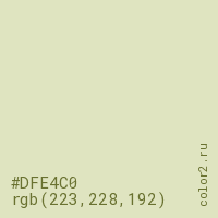 Цвет #DFE4C0 в цветовой модели RGB обозначается тремя октетами (223, 228, 192) в десятичном формате и #DFE4C0 в шестнадцатиричном (hex) формате, которые являются интенсивностью красного 223 (hex DF), интенсивность зелёного 228 (hex E4) и интенсивность синего 192 (hex C0).