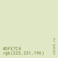 Цвет #DFE7C4 в цветовой модели RGB обозначается тремя октетами (223, 231, 196) в десятичном формате и #DFE7C4 в шестнадцатиричном (hex) формате, которые являются интенсивностью красного 223 (hex DF), интенсивность зелёного 231 (hex E7) и интенсивность синего 196 (hex C4).