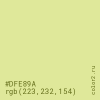 Цвет #DFE89A в цветовой модели RGB обозначается тремя октетами (223, 232, 154) в десятичном формате и #DFE89A в шестнадцатиричном (hex) формате, которые являются интенсивностью красного 223 (hex DF), интенсивность зелёного 232 (hex E8) и интенсивность синего 154 (hex 9A).